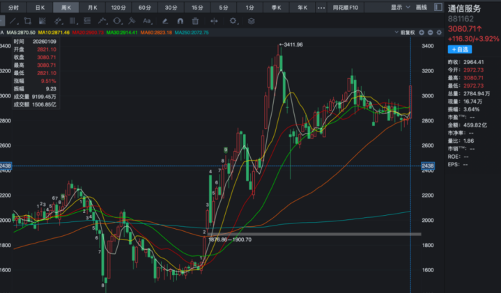 因为各行各业的公司在a股上中都是串联的,本周通信服务行业,上涨了9.5%。这些代表了行业方向之一,说明资金没有切换,还在半导体,在通信里。但是…