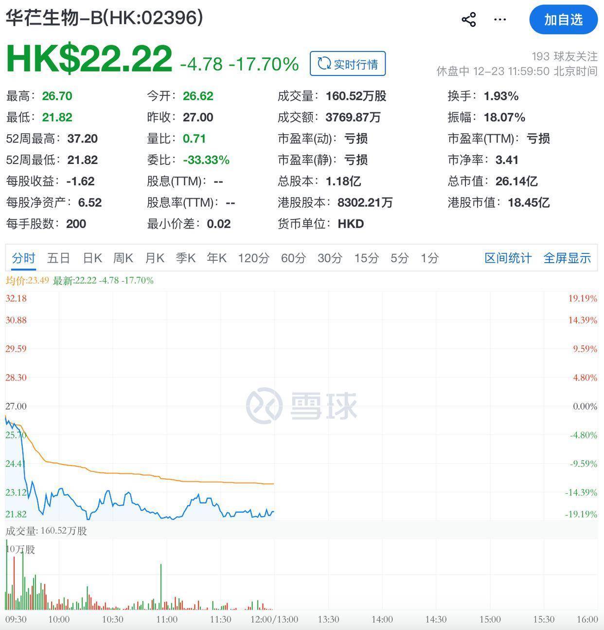 今日,公司股价延续了昨日(12月22日)上市首日破发的疲弱态势,开盘后继续下跌。截至午间休盘,公司股价跌17.70%,报22.22港元/股,市值26.14亿港元。